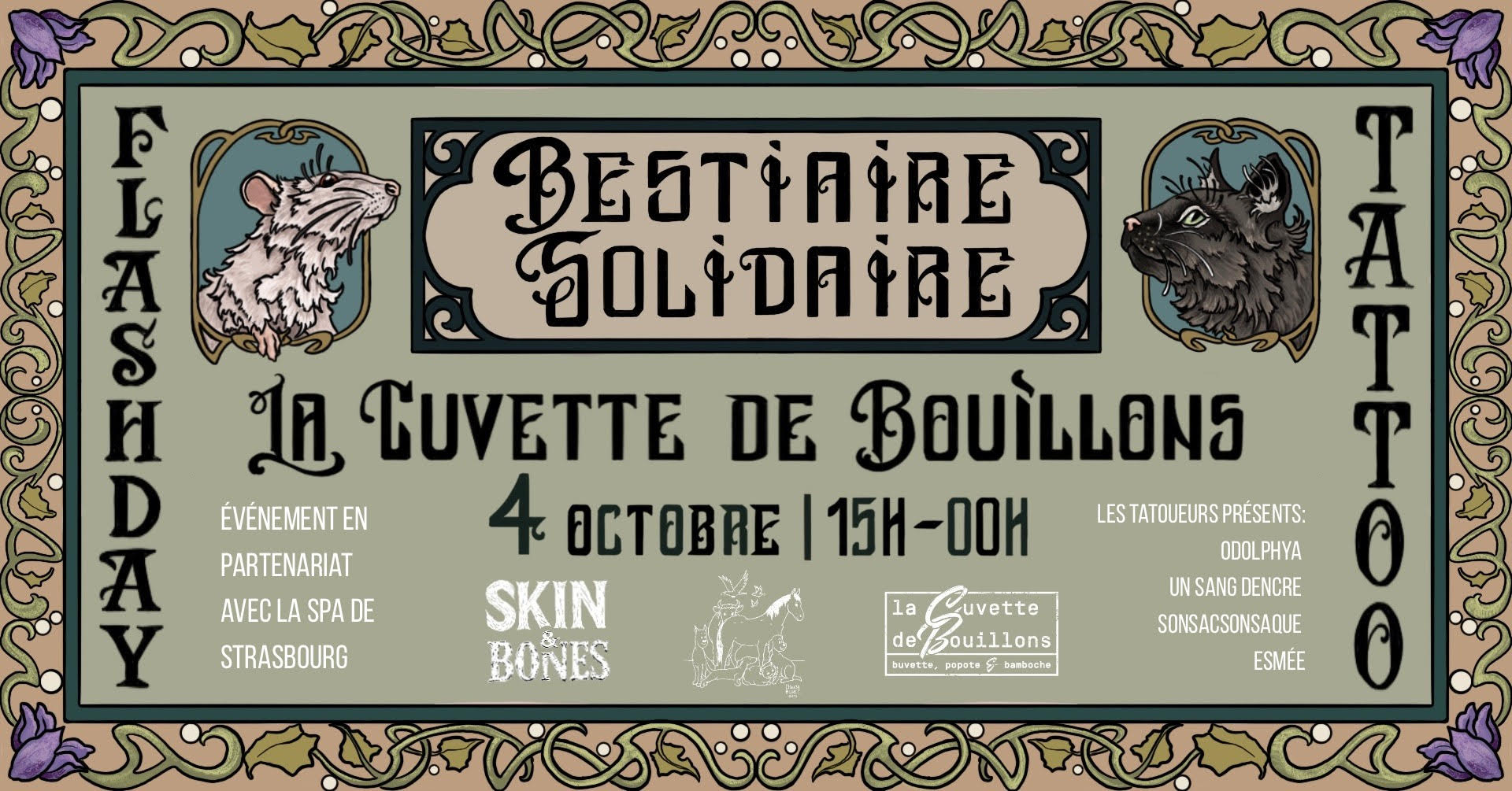 Pour cette première édition, le tatouage est à l’honneur. Nous vous invitons Samedi 4 octobre à la Cuvette de Bouillons, où se tiendra un flashday, de 15h à 00h. Plusieurs tatoueurs proposeront des flashs spécialement créés pour l’occasion, et 50% des bénéfices seront reversés à la SPA.