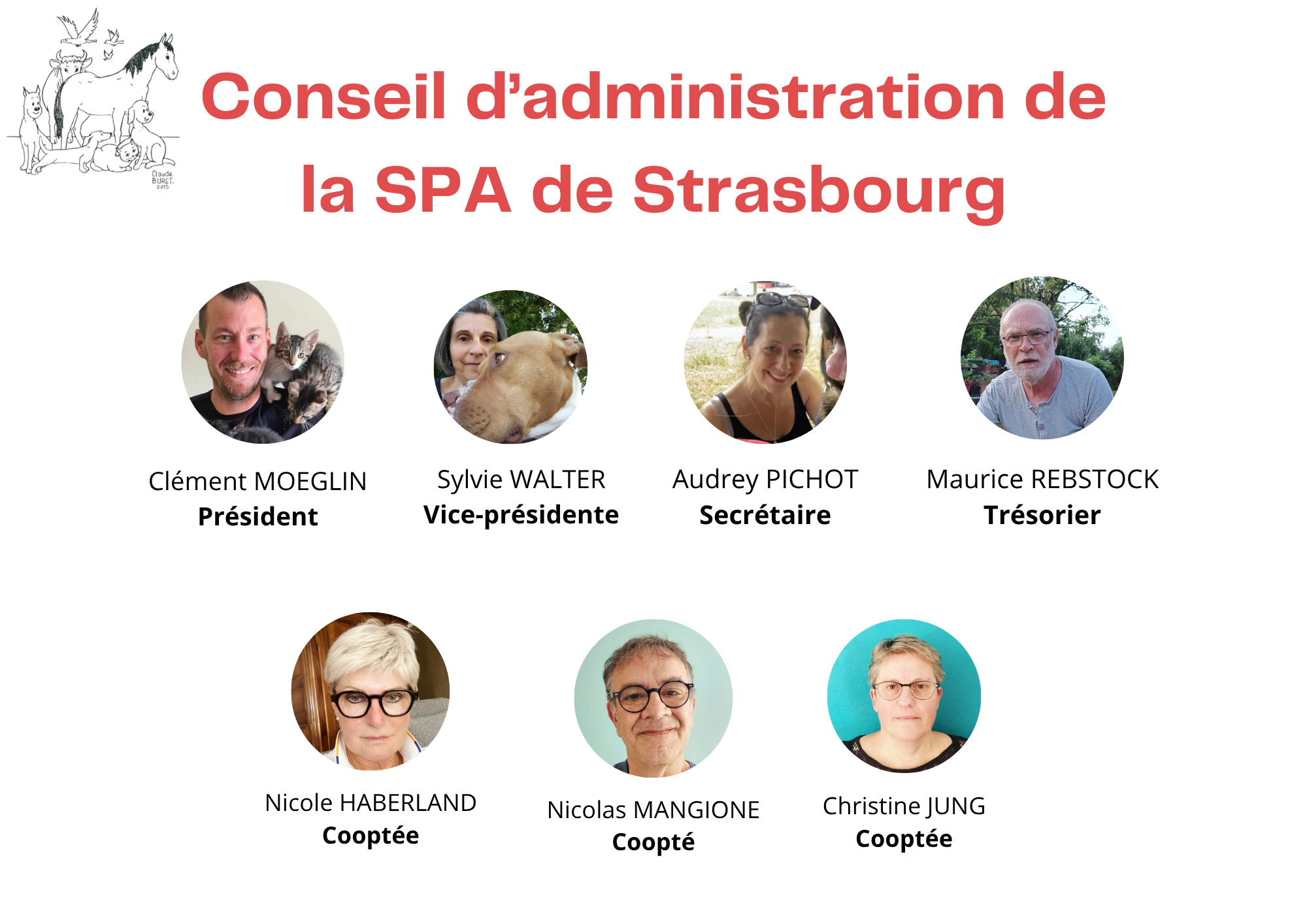 Vous trouverez ci-dessous les membres du nouveau Conseil d'Administration élu en mai 2023. Ces membres ont pour tâche de gérer et d'administrer le refuge animalier de la SPA de Strasbourg pour 3 ans.