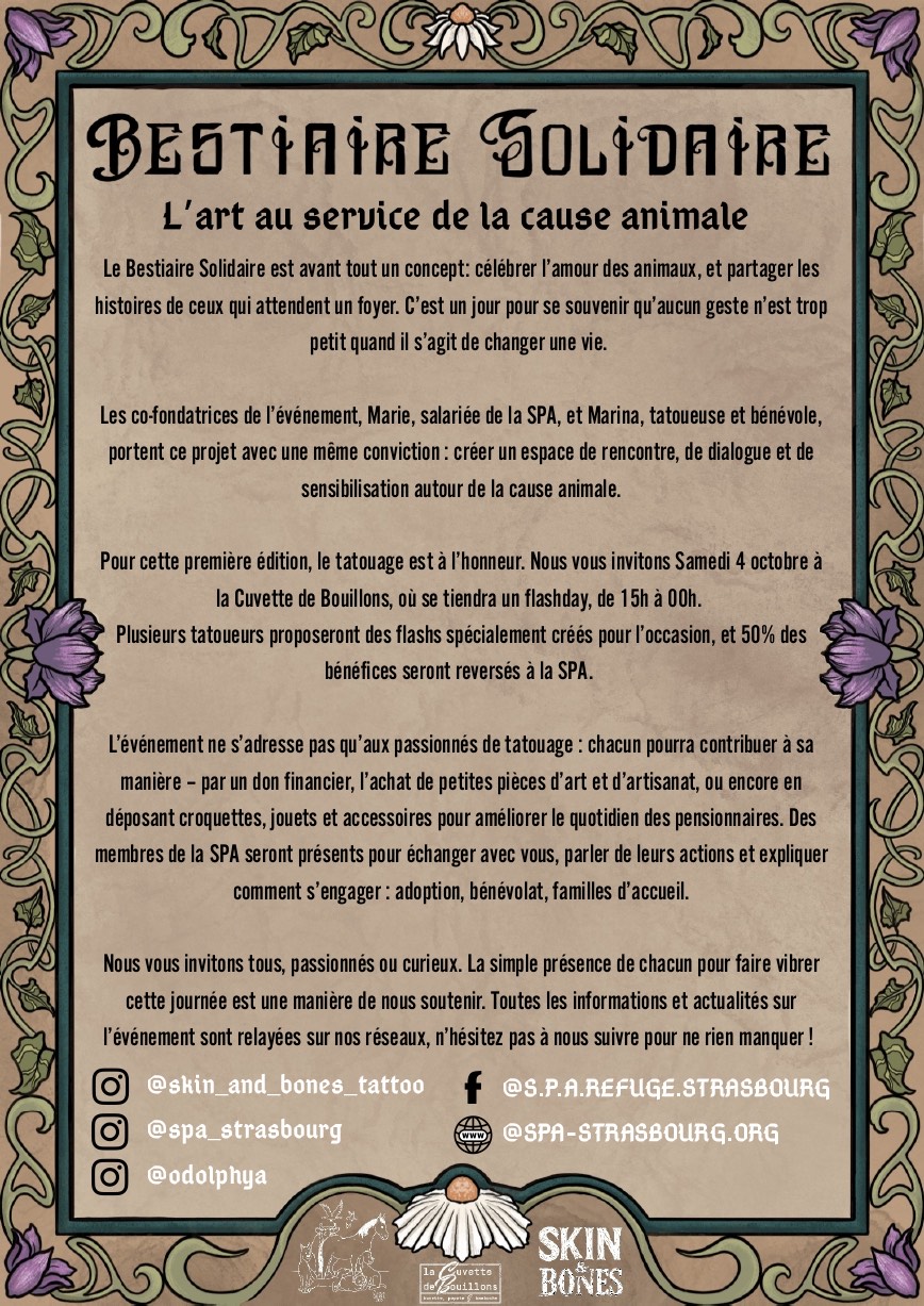 LA SPA de Strasbourg a le plaisir de vous annoncer qu'une journée Flash Day Tatoo aura lieu le 4 octobre 2025 à "La cuvette de Bouillons"