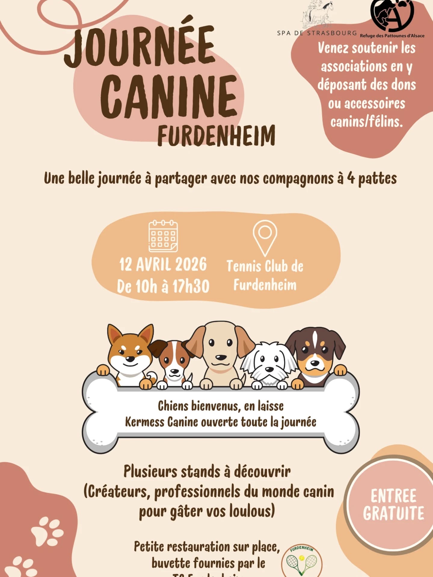 la 2eme journée canine🐶 est organisée à furdenheim, pour vos toutous. Des stands, des ateliers, des exposants et une collecte pour notre association est également organisée.